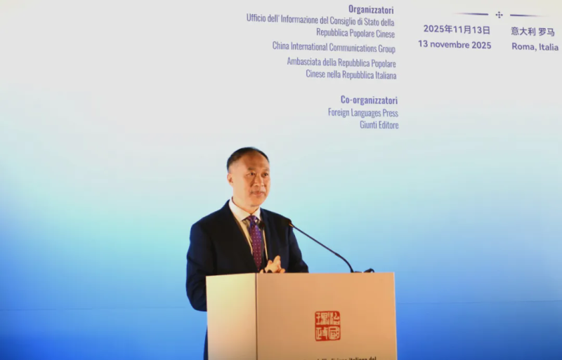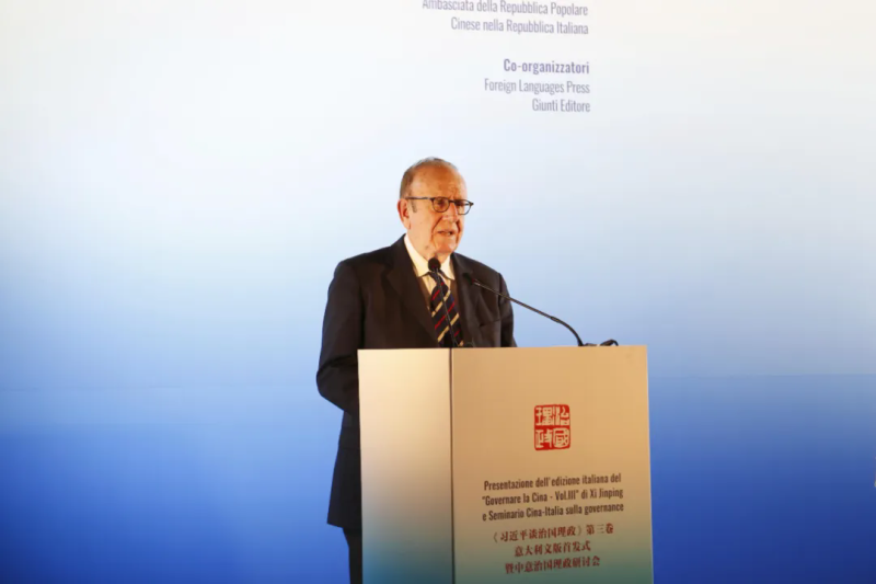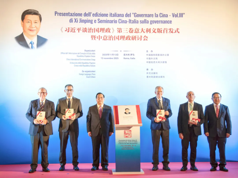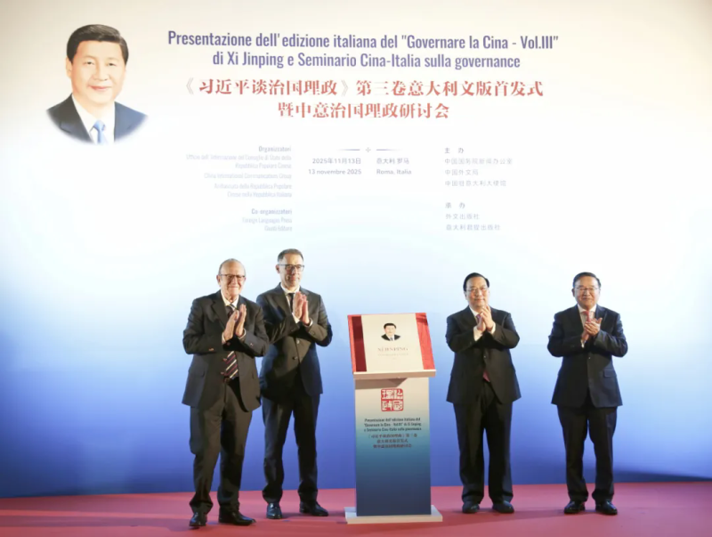 当地时间11月13日下午,由国务院新闻办公室、中国外文局和中国驻意大利大使馆主办,外文出版社、意大利君提出版社承办的《习近平谈治国理政》第三卷意大利文版首发式暨中意治国理政研讨会在意大利首都罗马举行。